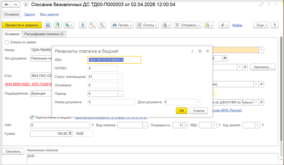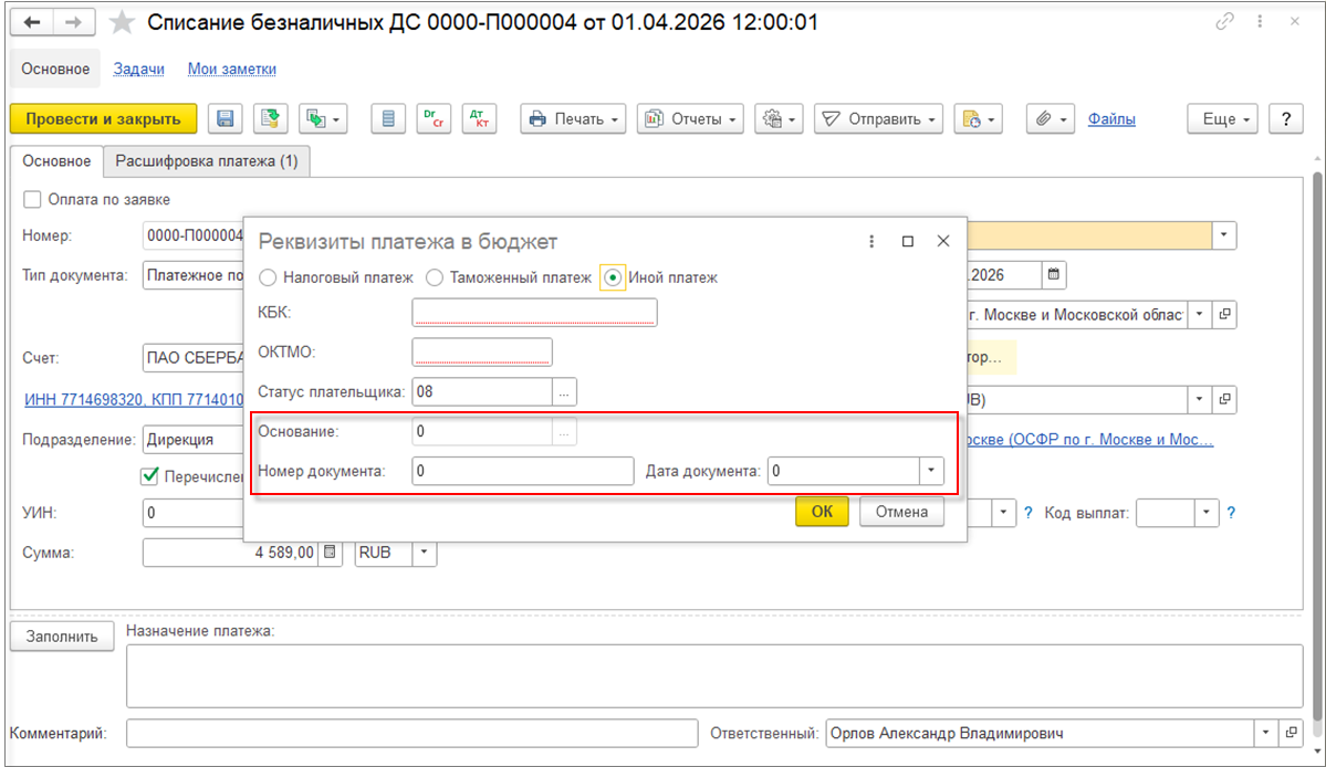 заполняются автоматически и не доступны для редактирования. КБК может заполняться по последнему аналогичному платежу;