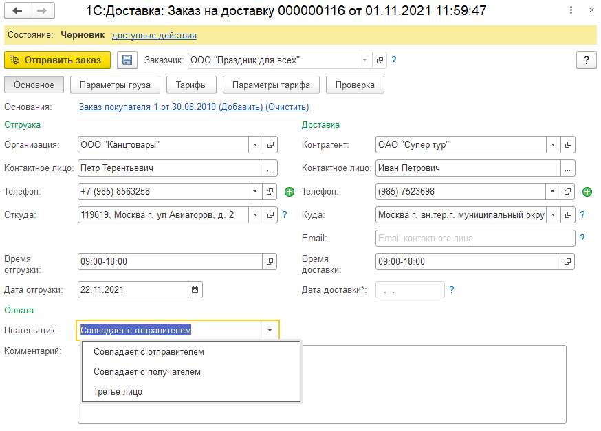 Плательщик по заказу на перевозку может совпадать с отправителем, совпадать с получателем или являться третьим лицом.