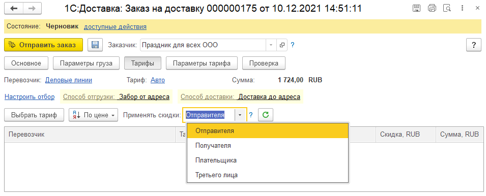 На закладке Тарифы предусмотрено применение скидок. Скидки могут отличаться в зависимости от роли клиента (заказчика) в грузоперевозке. Для применения скидок указывается для какого участника сделки применять скидки: