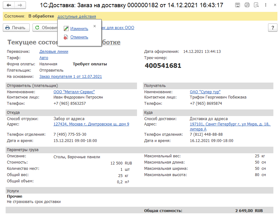 Внести изменения можно в карточке оформленного (состояние В обработке) заказа на доставку. Если перевозчик позволяет редактировать заказ, то на форме отображается ссылка Изменить заказ в группе Доступные действия.