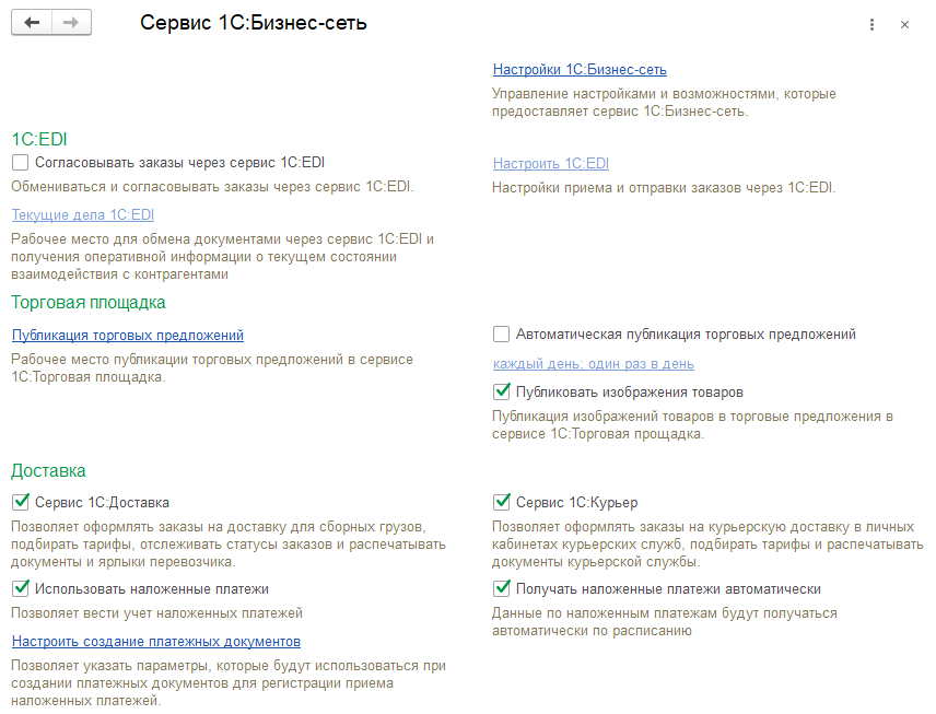 Возможность получения оплаты наложенным платежом включается функциональной опцией Использовать наложенные платежи в форме НСИ и администрирование – Настройка интеграции – 1С:Бизнес-сеть. Для создания и заполнения документов также требуется по ссылке Настроить создание платежных документов в форме НСИ и администрирование – Настройка интеграции – 1С:Бизнес-сеть указать контрагента, соответствующего перевозчику, а также договор экваринга с ним. Именно этот договор будет заполняться при автоматическом создании платежных документов от этого перевозчика. Настройки выполняет администратор.