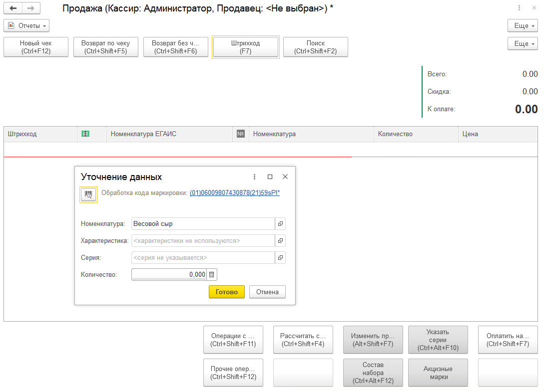 После вскрытия и отражения первой продажи поштучно или на розлив при последующих сканированиях данного кода маркировки будет доступна только продажа на розлив (поштучно), причем не более остатка по результатам предыдущих продаж из этой потребительской упаковки. Текущий остаток также выводится на форму Уточнение данных.