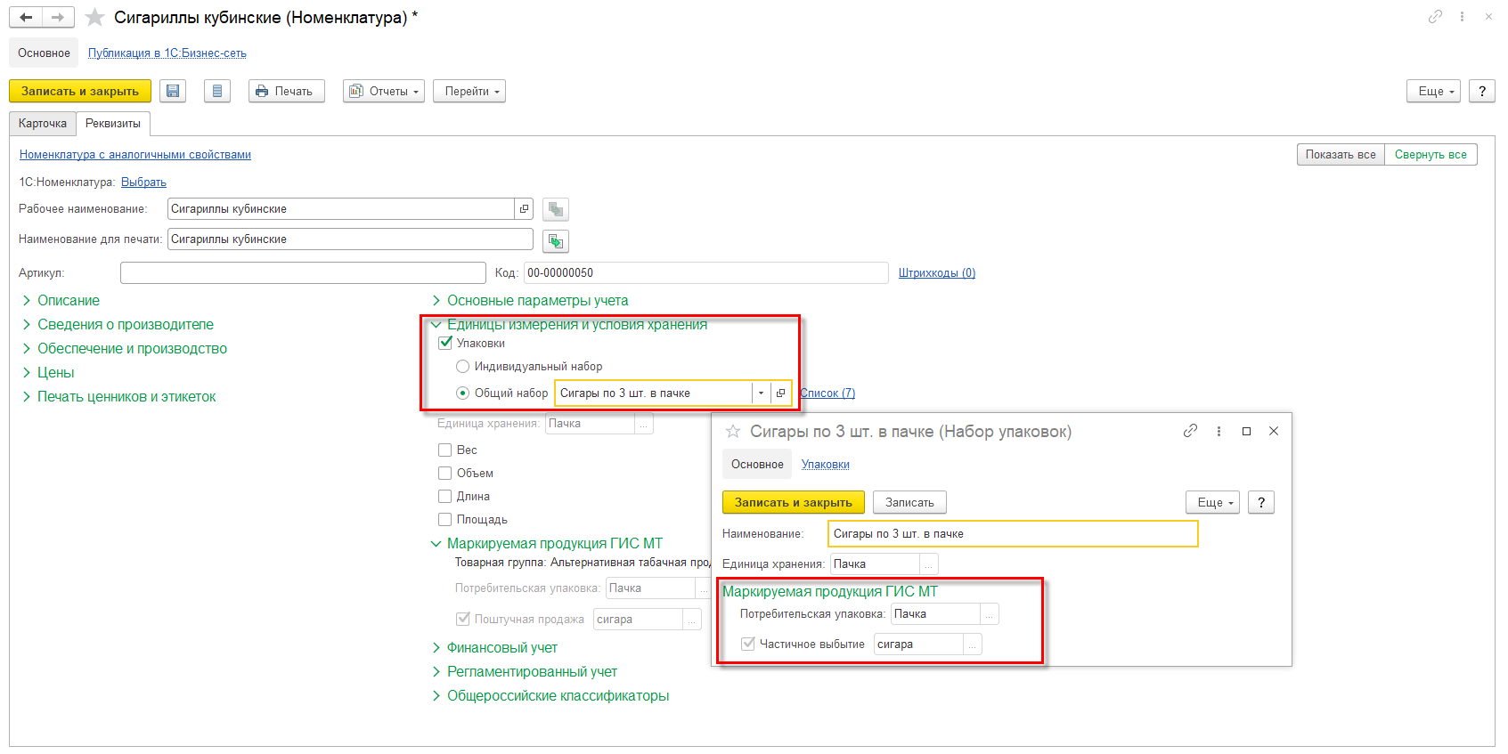 Основным сценарием считается продажа потребительскими упаковками и именно потребительская упаковка считается единицей хранения, если в карточке номенклатуры не задан набор упаковок. Возможность частичного выбытия маркируемой продукции доступна только в случае использования индивидуальных упаковок (установлен флажок Упаковки, переключатель в положении Индивидуальный набор). При этом в группе Маркируемая продукция ГИС МТ становятся доступными реквизиты Потребительская упаковка и Поштучная продажа, в которых соответственно нужно указать упаковку, которая соответствует потребительской упаковке маркируемого товара (пачка) и упаковку, которая используется для поштучной продаже. В частности, в список упаковок можно добавить единицу поштучной продажи (сигару), которая получается распаковкой потребительской упаковки.