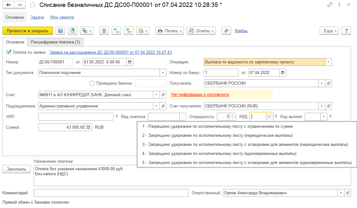 В рамках этих изменения в документах Заявка на расходование ДС и Списание безналичных ДС при осуществлении операций перечисления сотрудникам зарплаты и иных выплат изменяется и дополняется список значений для выбора в поля Код вида дохода (КВД).