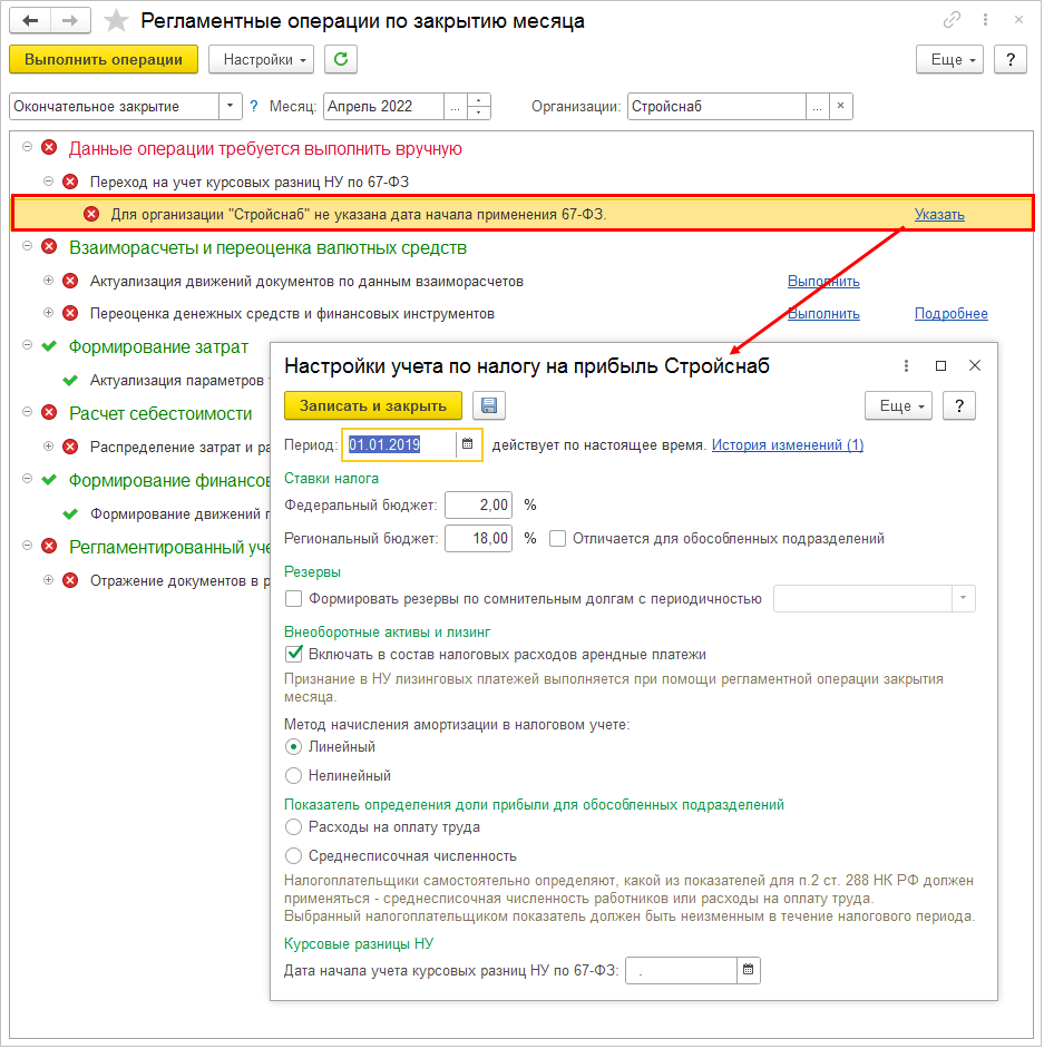 Необходимо обратить внимание, что после указания даты начала применения Закона 67-ФЗ в учетной политике необходимо будет выполнить процедуру Закрытие месяца за все периоды, начиная с указанного в опции Дата начала учета курсовых разниц НУ по 67-ФЗ.