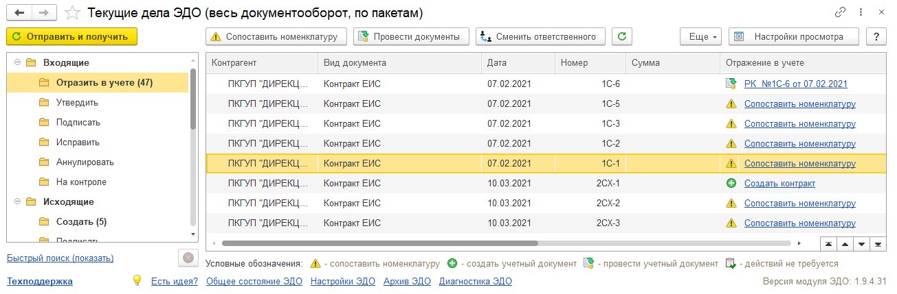 Контракты в сфере закупок загружаются из ЕИС в сфере закупок. Загруженные контракты отображаются в папке Входящие в форме Текущие дела ЭДО.
