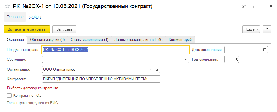 Также для элемента справочника государственного контракта при загрузке из ЕИС будут заполнены Этапы исполнения и Данные государственного контракта в ЕИС на соответствующих закладках.