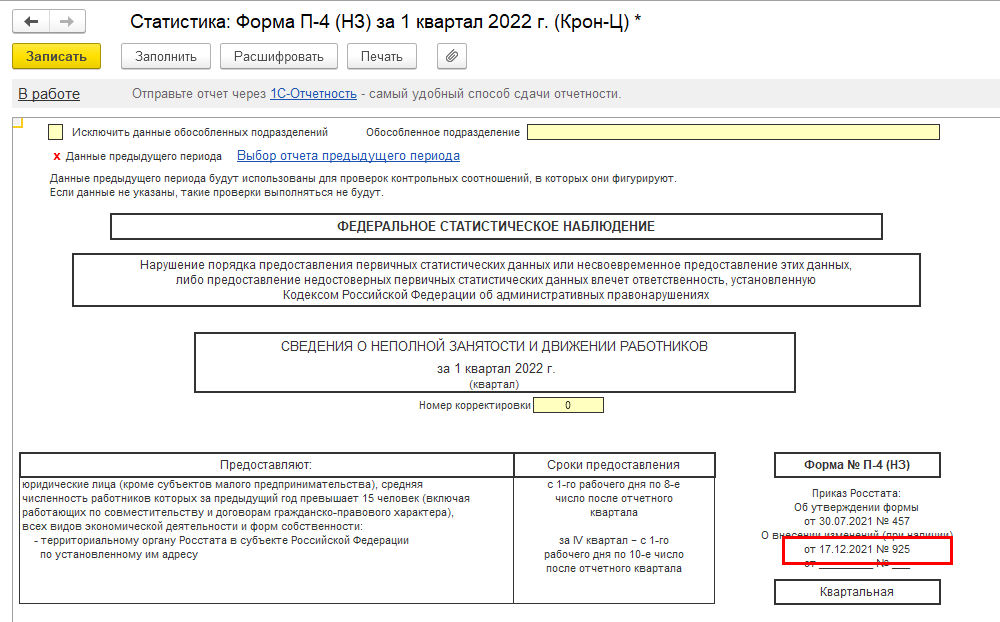 Реализовано заполнение формы П-4(НЗ) с 2022 года, в соответствии с приказом Росстата от 17.12.2021 № 925.