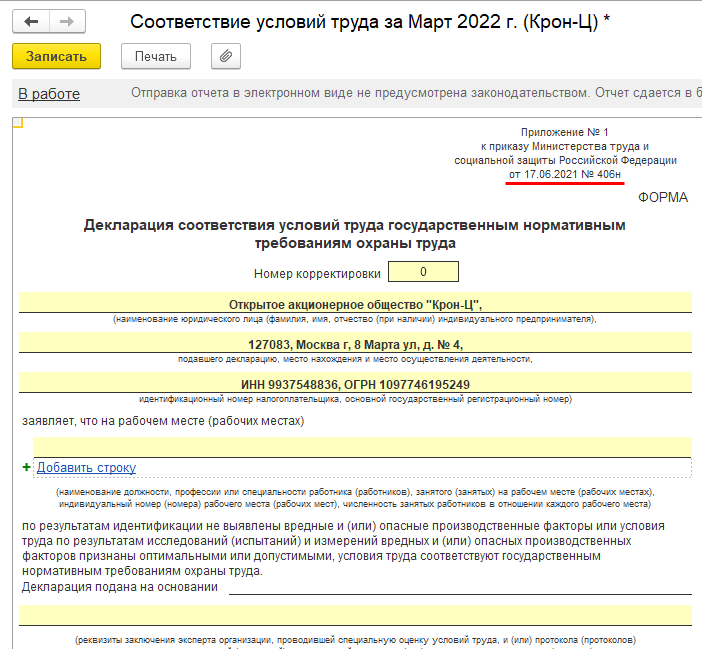 Обновлена форма Декларации соответствия условий труда с марта 2022 года, согласно Приказу Минтруда от 17.06.2021 № 406н.