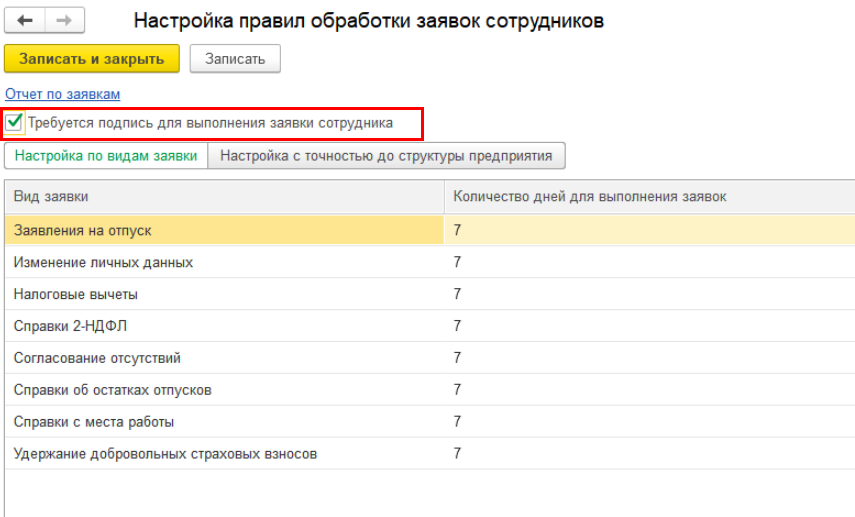 В форму настройки правил обработки заявок сотрудников добавлен флажок "Требуется подпись для выполнения заявки сотрудника".