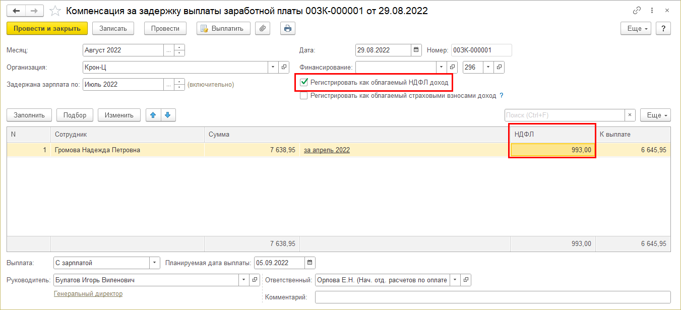 В документ "Компенсация за задержку выплаты заработной платы" добавлен флажок "Регистрировать как облагаемый НДФЛ доход". Если его установить, в документе рассчитывается и регистрируется НДФЛ.