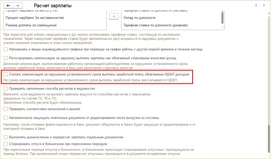 Также добавлена настройка расчета зарплаты "Считать компенсацию за нарушение установленного срока выплаты заработной платы облагаемым НДФЛ доходом". Если ее установить, то новый флажок автоматически устанавливается при создании документов.