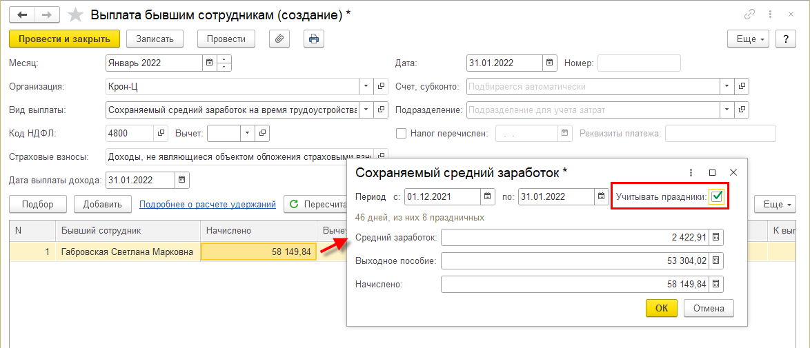 Реализован учет нерабочих праздничных дней при расчете сохраняемого среднего заработка в документе "Выплата бывшим сотрудникам", создаваемом на основании увольнения, согласно Постановлению Конституционного суда от 13.11.2019 № 34-П.