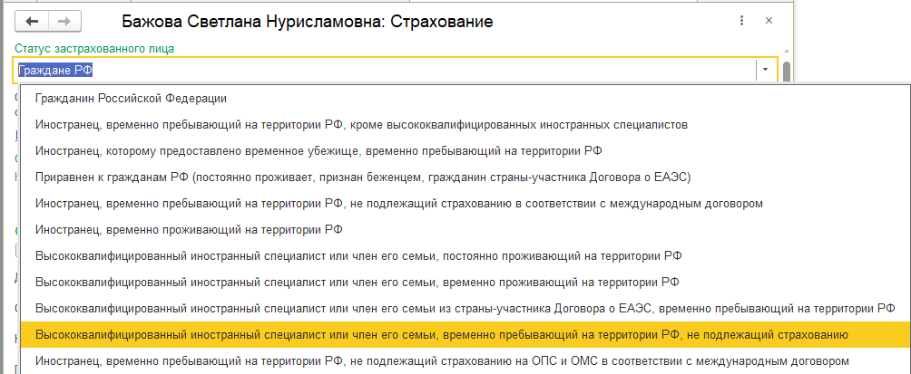 В результате исправления ошибки 50014606 добавлен новый статус застрахованного лица "Высококвалифицированный иностранный специалист или член его семьи, временно пребывающий на территории РФ, не подлежащий страхованию". Необходимо разделить нестрахуемых лиц на не-ВКС и ВКС, и для ВКС указать новый статус.