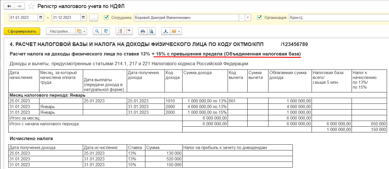 В отчете "Регистр налогового учета по НДФЛ" с 2023 года все доходы объединённой налоговой базы показываются в одной таблице Раздела 4. Отдельно показываются подарки, облагаемые по ставке 13% без прогрессивной шкалы.