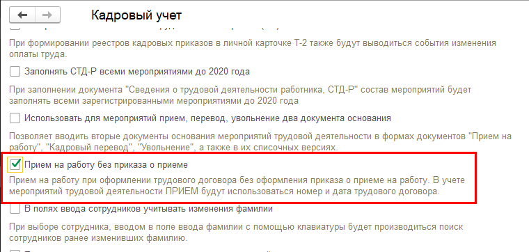 В программу добавлена новая настройка кадрового учета "Прием на работу без приказа о приеме".