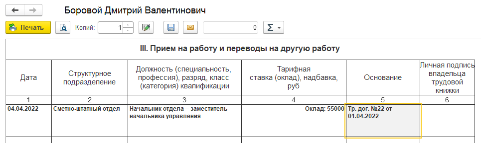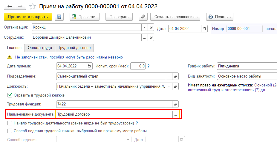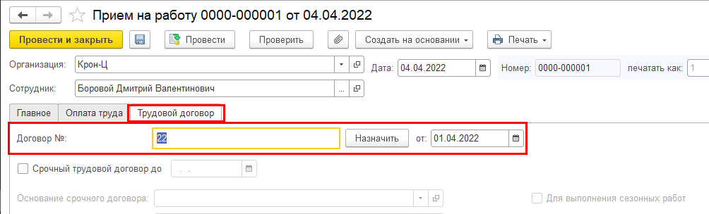 Если она установлена, в документе "Прием на работу" становится обязательным указание номера и даты трудового договора (на закладке "Трудовой договор").