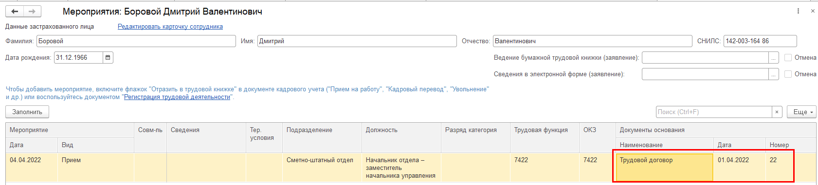 В мероприятии ПРИЕМ в СЗВ-ТД вместо номера и даты документа заполняется номер и дата трудового договора.