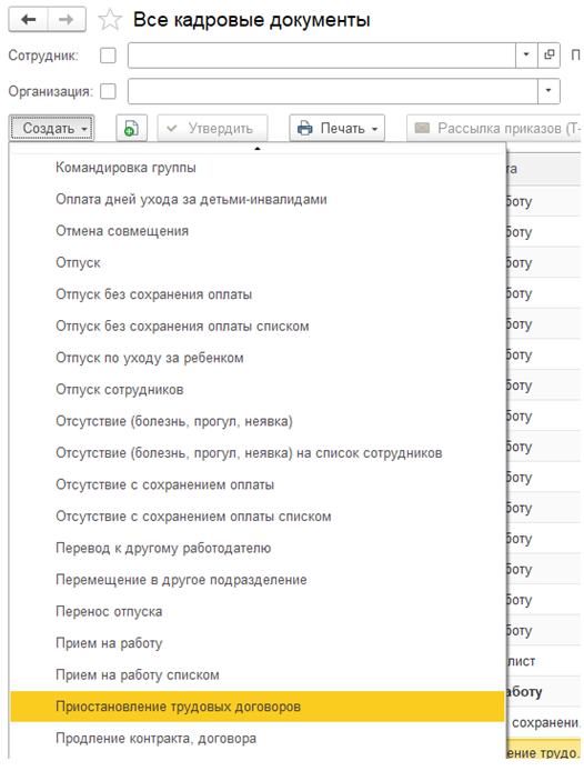 Реализована возможность приостановки трудовых договоров на период мобилизации и других подобных событий.