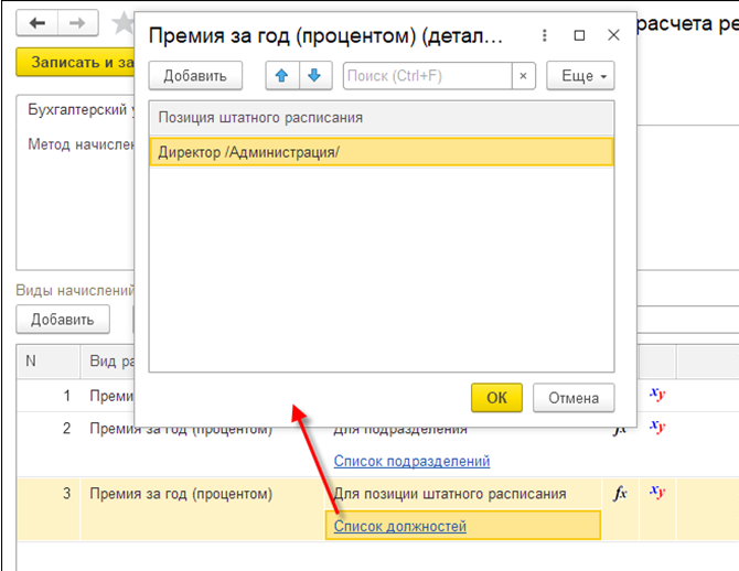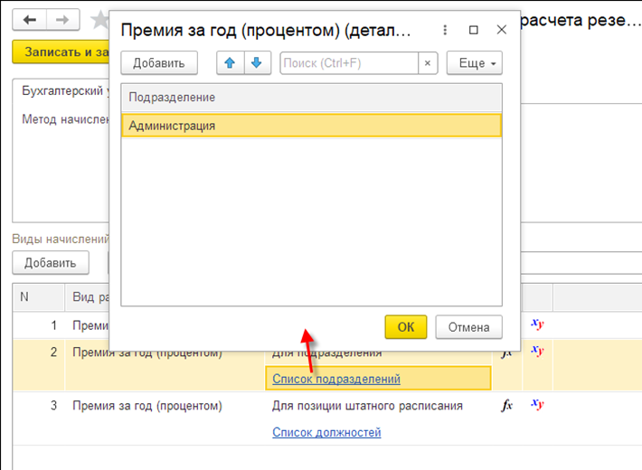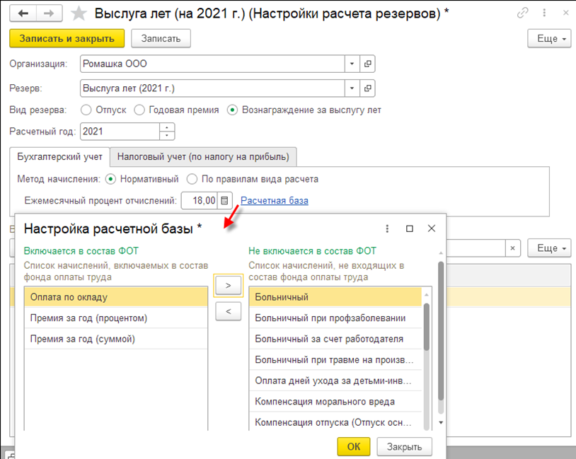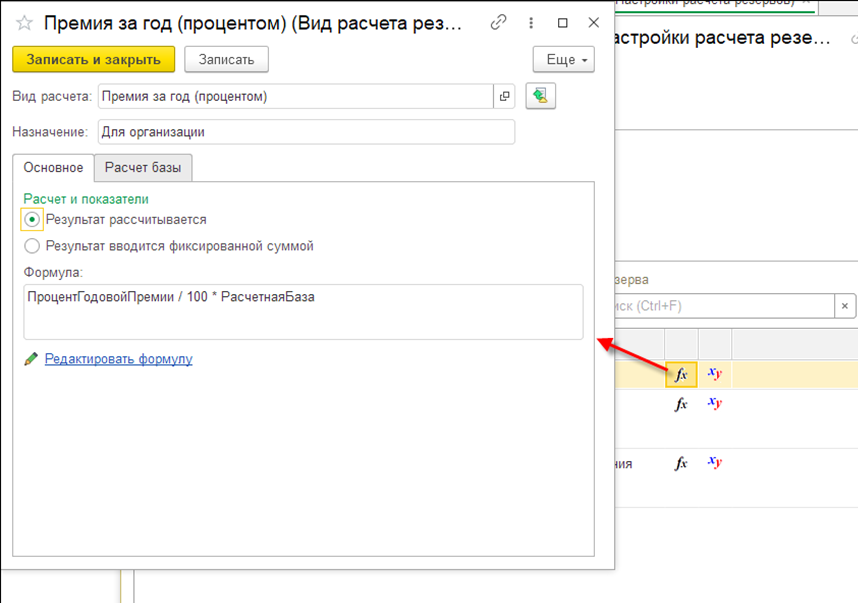 Здесь непосредственно и осуществляется настройка порядка расчета. При создании новой настройки следует указать организацию, резерв и уточнить вид создаваемого резерва (отпуск, годовая премия и т.п.).