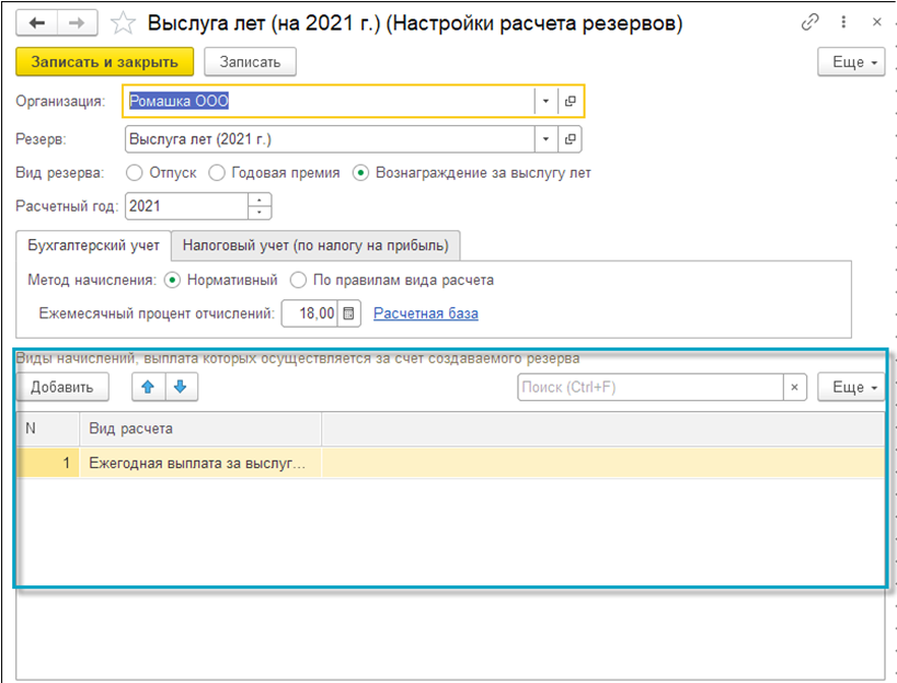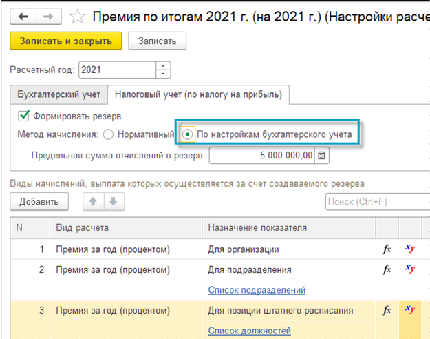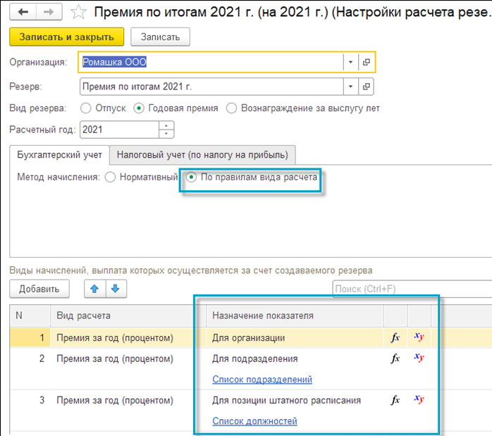 Более точный метод расчета резервов – метод, учитывающий правила вида расчета. Если выбрать его на вкладке "Бухгалтерский учет", то доступна более тонкая настройка порядка расчета.
