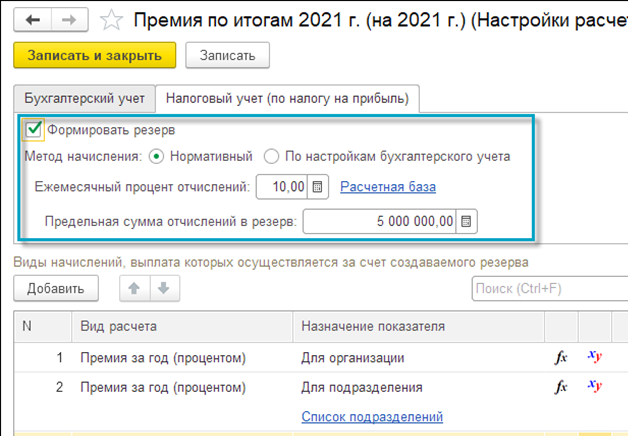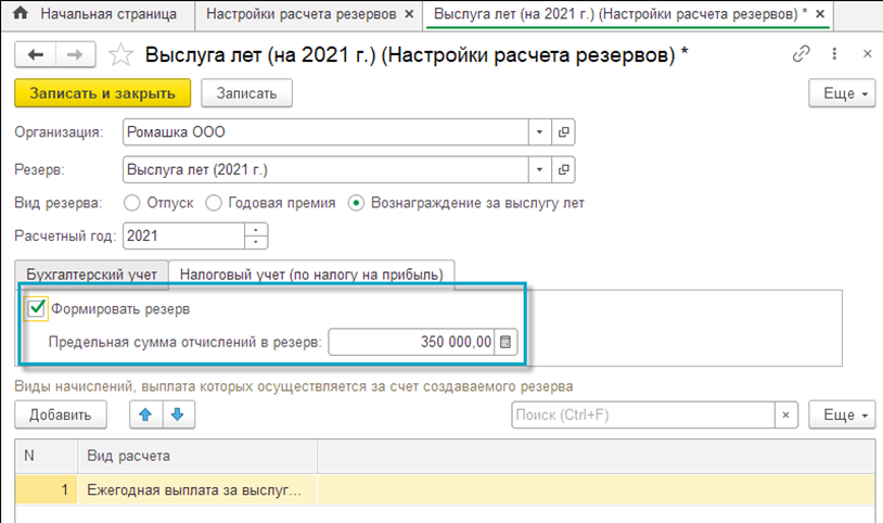 Если резерв формируется и в налоговом учете, то на вкладке "Налоговый учет (по налогу на прибыль)" следует установить флажок "Формировать резерв" и указать предельную величину отчислений в резерв. Это размер отчислений именно того года, за который вводится настройка. Предельная величина используется только при начислении резерва в налоговом учете.