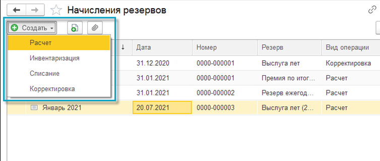 У документа расчета резервов 4 вида операции: