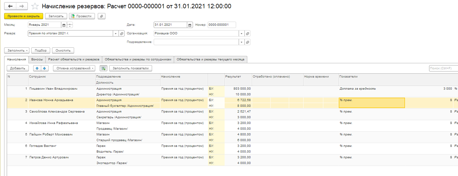 Для работы с документом в шапке следует указать организация, месяц, резерв и нажать "Заполнить".