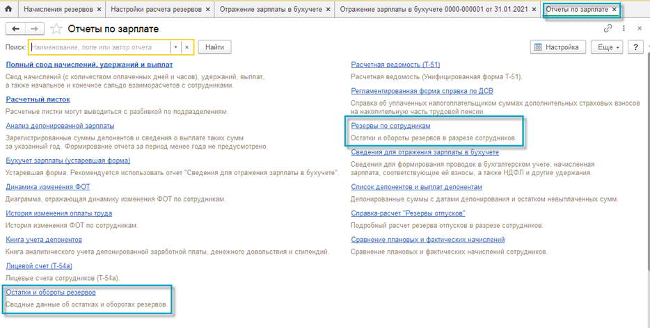 Посмотреть движения резервов можно отчетами "Остатки и обороты резервов" и "Резервы по сотрудникам" в разделе "Зарплата – Отчеты по зарплате".