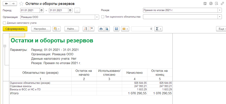 После принятия решения о выплате премии в программе вводится соответствующий документ. После чего, в конце месяца формируется документ "Отражение зарплаты в бухучете". При заполнении документа анализируется, какие виды начислений были задействованы в текущем месяце и проверяет наличие настроек резервов для таких начислений. Если вид начисления включен в настройки резерва, то он отражается за счет этого резерва: в бухгалтерском учете в пределах накопленной суммы, в налоговом учете – за счет резерва. Для этого в документе добавлены колонки, по которым видно как именно в учете отражается резерв. Эти данные требуются для отражения в регламентированном учете.