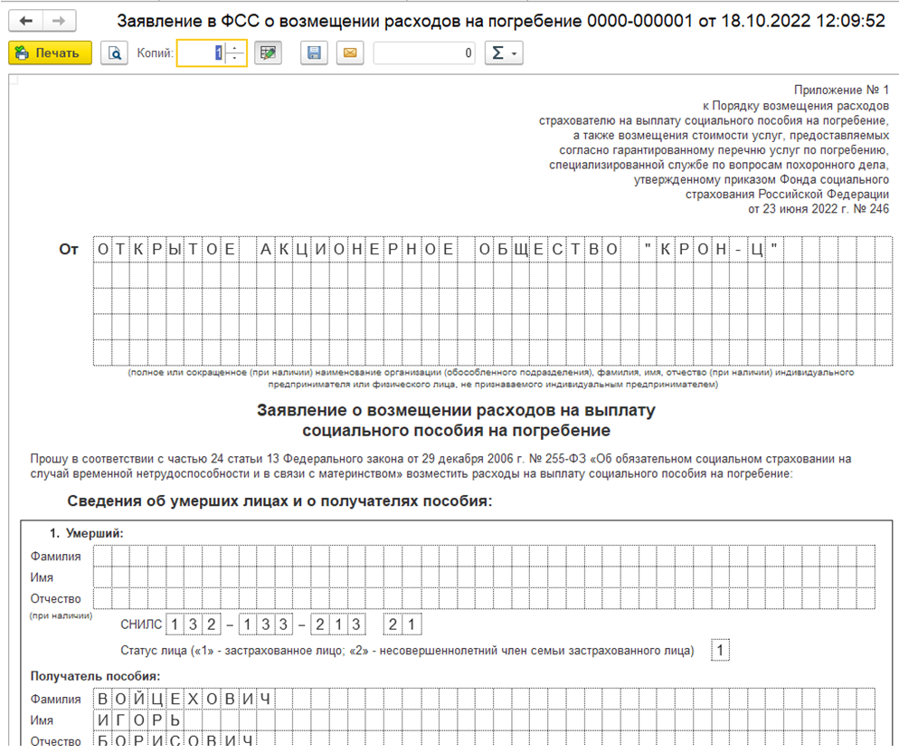Реализована новая печатная форма документа "Заявление в ФСС о возмещении расходов на погребение", применяемая с 13.09.2022 в соответствии с приказом ФСС РФ от 23.06.2022 № 246.