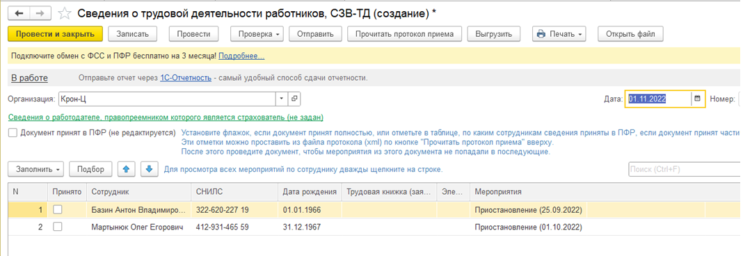 В СЗВ-ТД и СЗВ-СТАЖ сведения о приостановке автозаполняются только при их формировании начиная с даты запуска возможности приема таких сведений со стороны ПФР. На момент выпуска версии она установлена 01.11.2022, но может быть обновлена через интернет.