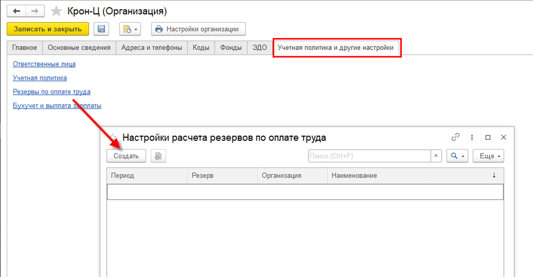 Настраивается учет резервов через учетную политику организации. Осуществляется переход в список настроек учета и расчета резервов.