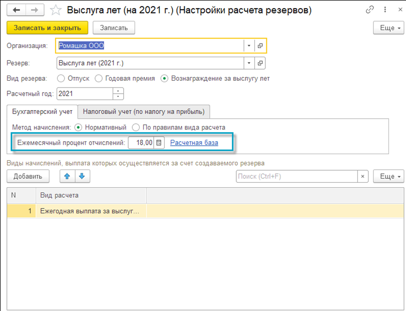 Для максимального сближения бухгалтерского и налогового учета можно воспользоваться вариантом расчета "По настройкам бухгалтерского учета". В этом случае расчет ежемесячной суммы отчислений будет производиться одинаково в бухгалтерском и налоговом учете. Однако задать предельную величину в налоговом учете все равно требуется.