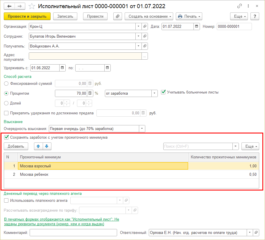 В исполнительный лист добавлен флажок "Сохранять заработок с учетом прожиточного минимума". При его установке появляется таблица, где нужно указать сохраняемые виды прожиточных минимумов (добавив в справочник необходимые) и коэффициенты (например, 1 прожиточный минимум для трудоспособного населения и 0,5 прожиточного минимума на ребенка).