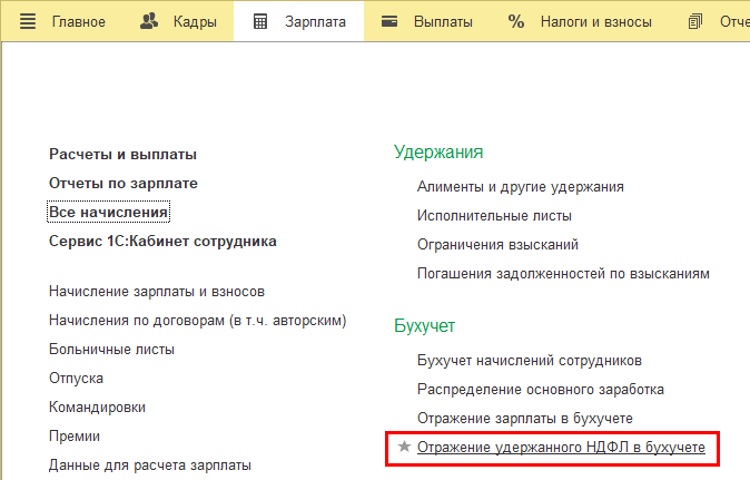 Добавлена возможность сформировать сведения об удержанном НДФЛ при переходе на Единый налоговый платеж (ЕНП). Добавлен документ "Отражение удержанного НДФЛ в бухучете" (раздел Зарплата – Бухучет).