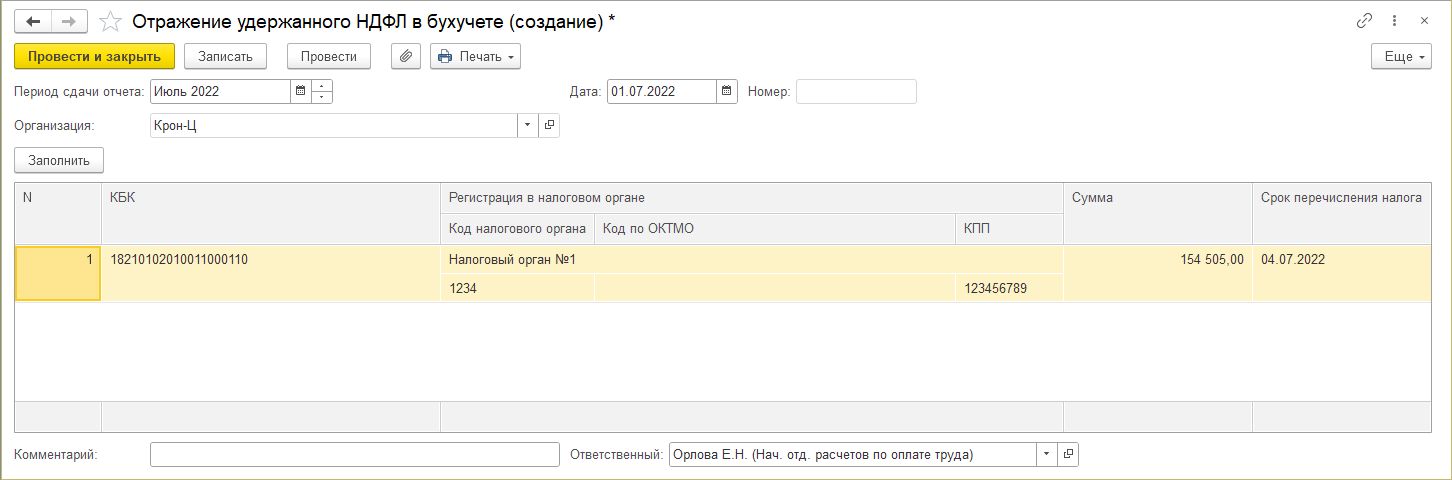 При заполнении документа в него помещается удержанный НДФЛ со сроком перечисления, соответствующим месяцу, за который заполняется документ (например, зарплату за январь выплатили в феврале, удержанный налог попадает в документ за февраль). Поддерживается заполнение нескольких документов за месяц: во второй документ помещаются данные как разность между полученными данными за период минус уже зарегистрированные данные.