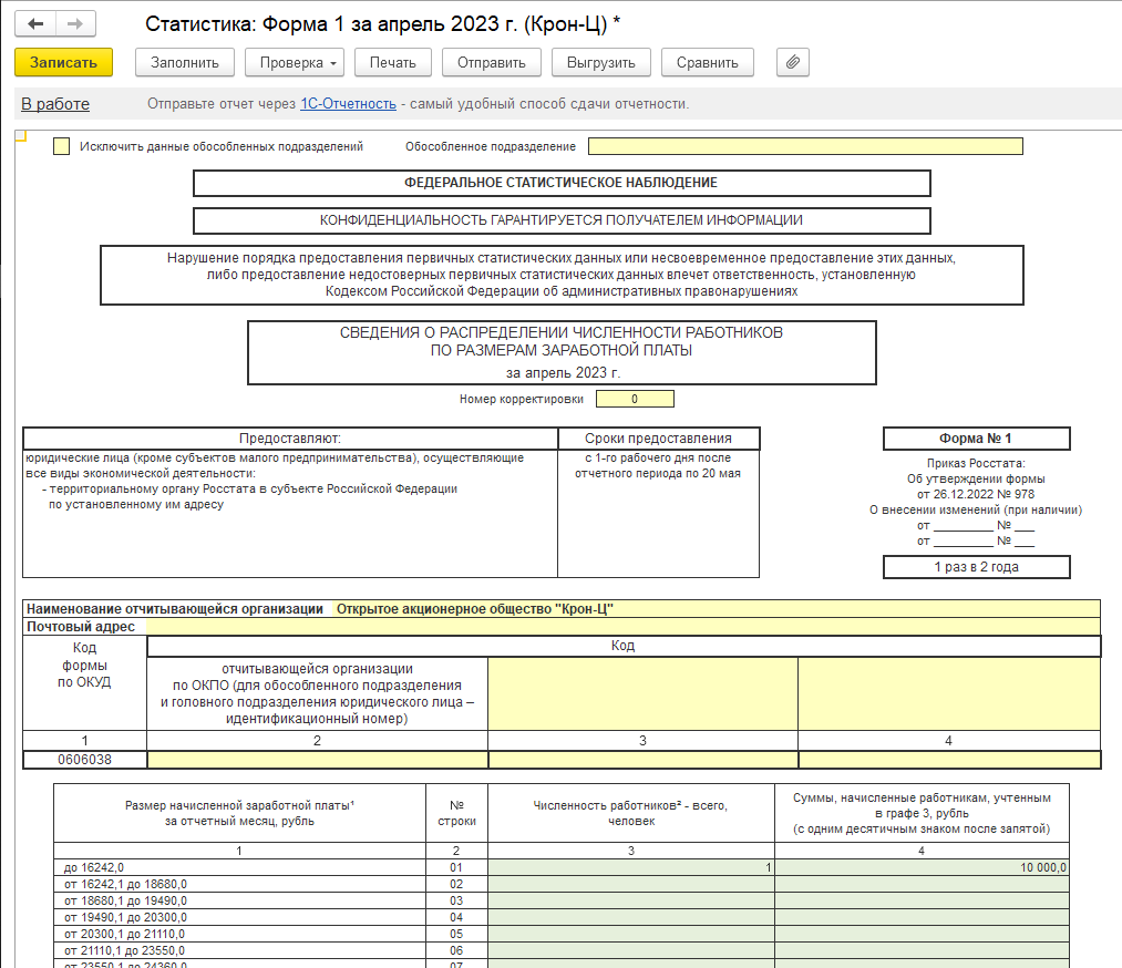 Реализовано заполнение формы федерального статистического наблюдения № 1 "Сведения о распределении численности работников по размерам заработной платы" для отчета за апрель 2023 года, согласно Приказу Росстата от 26.12.2022 № 978.