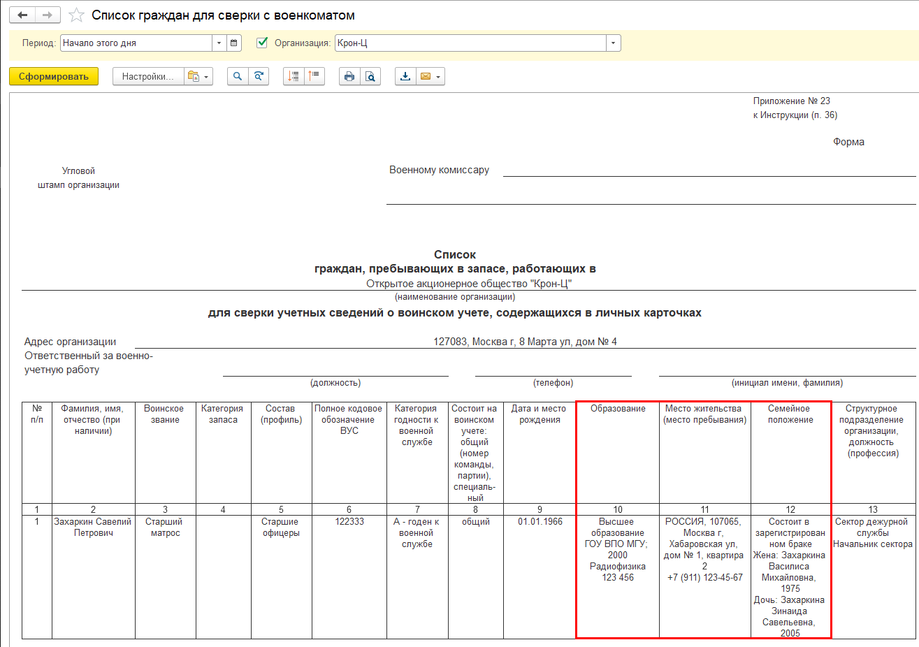 В отчете "Список граждан для сверки с военкоматом" расширен состав выводимой информации о семейном положении (добавлен год рождения), образовании и месте жительства (пребывания). Теперь они выводятся аналогично карточке гражданина, подлежащего воинскому учету.