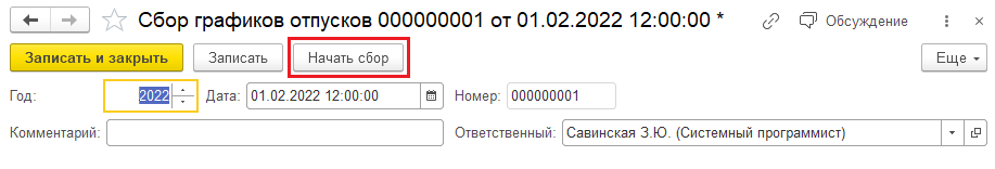 Старт кампании формирования графика начинается с создания этого документа. Первоначально, так как сбор ещё не начат, доступна форма документа лишь с выбором года, за который собираются пожелания, и командой "Начать сбор":