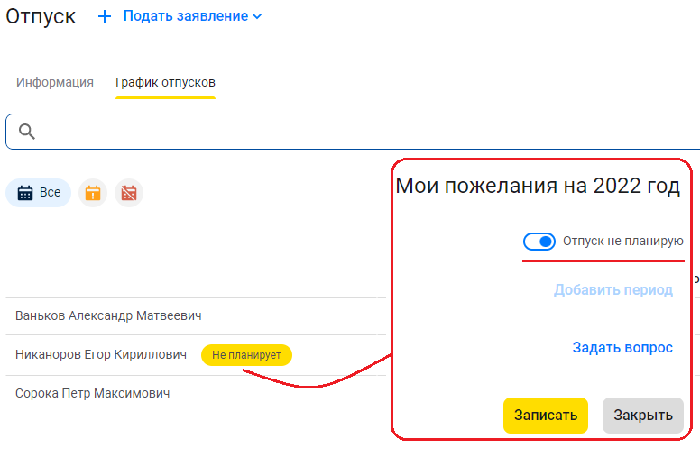 Помимо этого, если по каким-либо причинам сотрудник не планирует или освобожден от заполнения пожеланий по отпуску на указанный год, он может взвести соответствующий флаг в карточке планирования периодов отпуска. В таком случае в списках планирования графика отпусков, который видят его коллеги или руководитель, напротив его имени будет выводиться информационный бейдж: