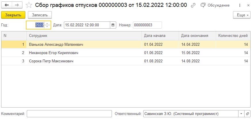 вкладка График отпусков, на которой размещена соответствующая таблица