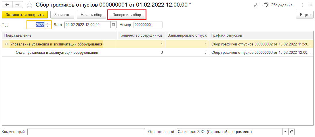 Весь же процесс сбора на стороне приложения можно наблюдать в документе "Сбор графиков отпусков" (по компании) – том документе, из которого был дан старт кампании по сбору. В нем после старта кампании в виде дерева отражается информация по подразделениям, а также по документам с пожеланиями, которые поступили из кабинетов сотрудников после завершения кампании на их стороне. В этом же документе происходит завершение сбора графиков отпусков по предприятию нажатием соответствующей команды: