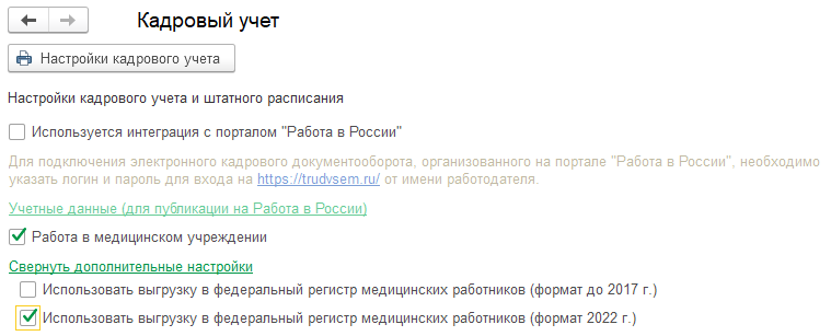 Для получения доступа к функционалу работы с федеральными медрегистрами необходимо в меню "Настройка" - "Кадровый учет", при установленном флаге "Работа в медицинском учреждении", установить флаг "Использовать выгрузку в федеральный регистр медицинских работников (формат 2022 г.)":