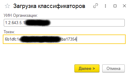 Сначала необходимо загрузить данные классификаторов. Интерфейс загрузки выполнен в виде "мастера" и на любом этапе можно вернуться к предыдущему шагу, нажав "Назад", в том числе и во время ожидания завершения загрузки. На первом шаге необходимо ввести идентификатор организации по классификации Минздрава и токен доступа, который можно получить в личном кабинете, авторизовавшись на портале http://nsi.rosminzdrav.ru. Актуальную и более подробную информацию о получении доступа можно найти в разделе помощи этого портала. Когда идентификационные данные указаны, следует нажать "Далее>":