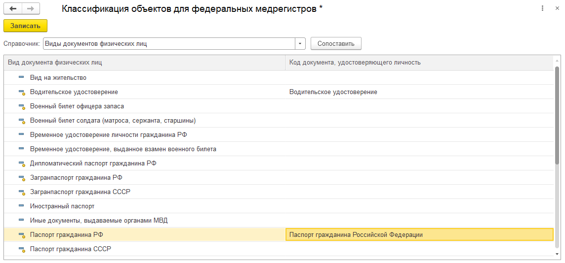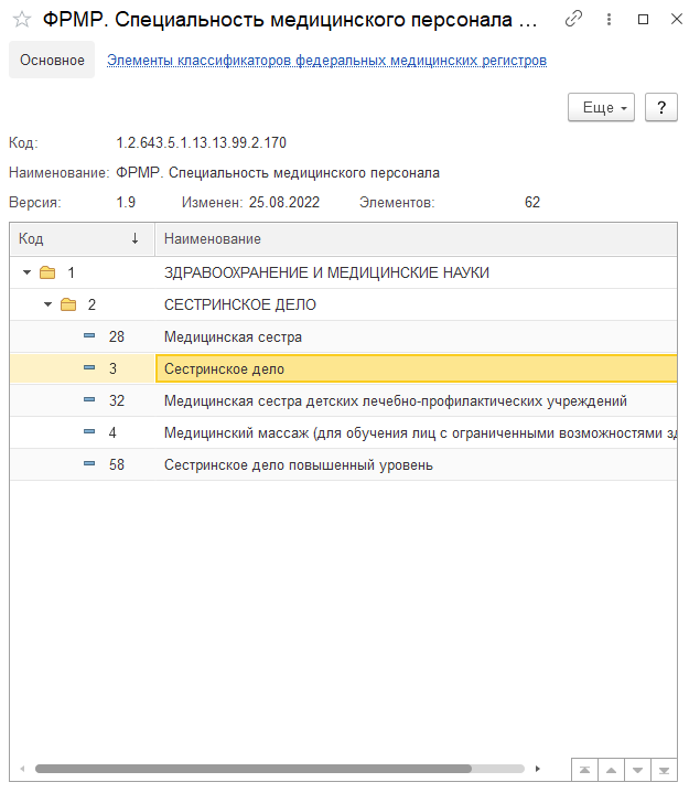 Если ей воспользоваться, появится форма для задания соответствия элемента справочника всем подходящим классификаторам НСИ Минздрава: