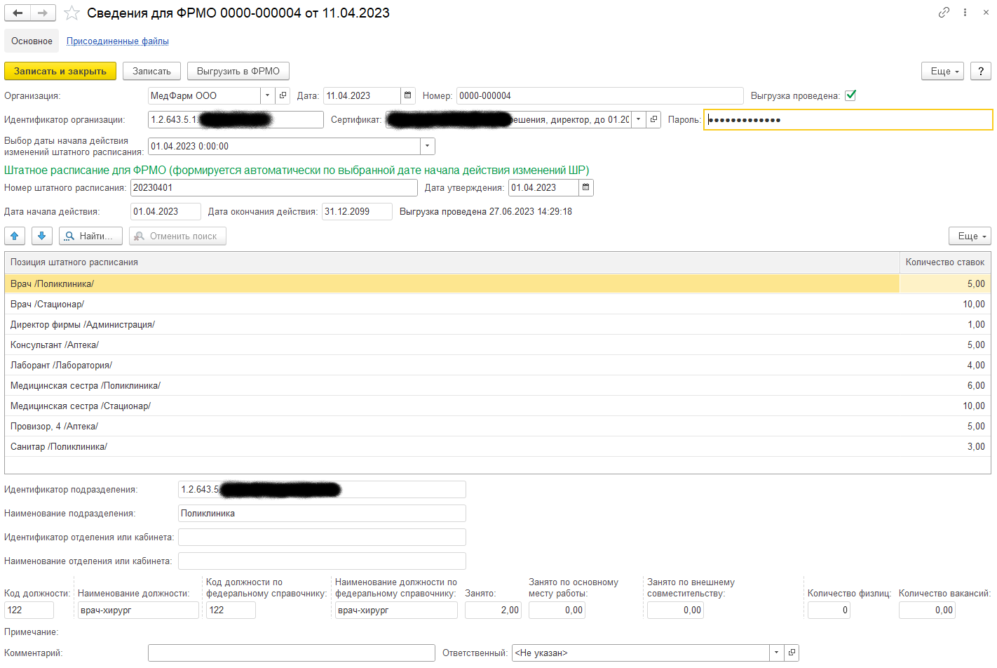 Выгрузка штатного расписания является действием вспомогательного характера, без которого невозможно взаимодействие с ФРМР, поэтому её необходимо провести до выгрузки в ФРМР. Иначе могут возникнуть ошибки проверки наличия позиций штатного расписания при выгрузке личных дел медработников. Для отправки данных в ФРМО следует создать документ "Сведения для ФРМО" в меню "Кадры". В новом документе необходимо заполнить идентификатор медицинского учреждения, выбрать сертификат ЭЦП и ввести к нему пароль (если установлен). Идентификатор и сертификат запоминаются для организации документа и при создании других документов заполняются уже автоматически.