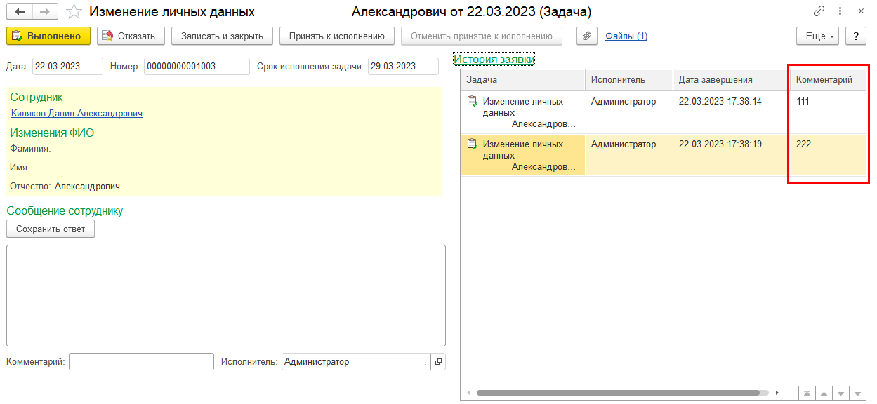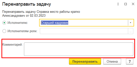 Реализовано отображение на форме заявки комментария из окна перенаправления заявки на другого сотрудника.