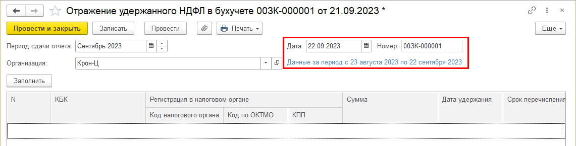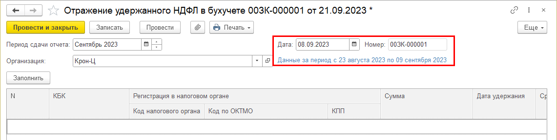 В документ добавлена колонка "Дата удержания". Колонка показывается в документах начиная с сентября 2023 г. При дате документа по 12 число включительно заполняются данные за период с 23 числа предыдущего месяца по 9 число текущего, после 12 числа: по 22 число текущего. При заполнении документа в него попадают данные, еще не зарегистрированные в текущем месяц, т.е. в документе с периодом "с 23 по 9" будет налог, удержанный по 9 число, с периодом "с 23 по 22": удержанный с 10 по 22.