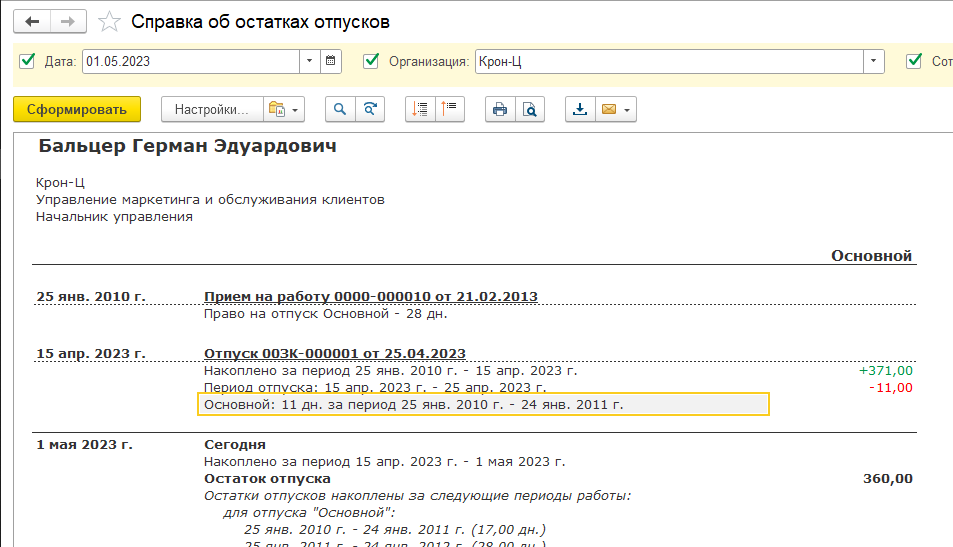Реализован вывод в справке по отпускам периода, за который предоставлен отпуск, а также расшифровка заработанных дней отпуска за вредность.